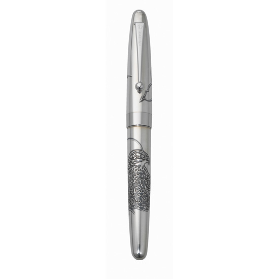 Hand-wrought sterling silver lends elegance and grace to the Sterling Collection. Hawk and Dragon designs are beautifully etched on the pen barrel and cap. The distinctive style of the Sterling Collection fountain pens is completed with an 18 karat gold fine, medium or broad inlaid nib. Also available in a matching rolling ball pen. All are packaged in a rich black gift box.